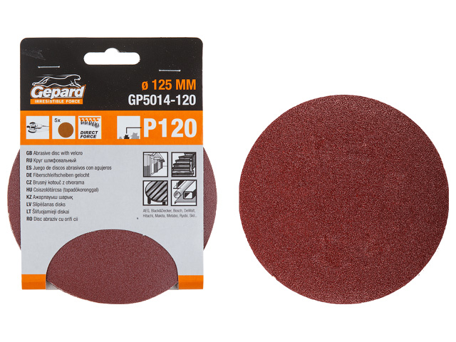 Шлифлист 125мм круг Р120 д/дерева 5шт. GEPARD (GP5014-120) (круг абразивный шлифовальный)