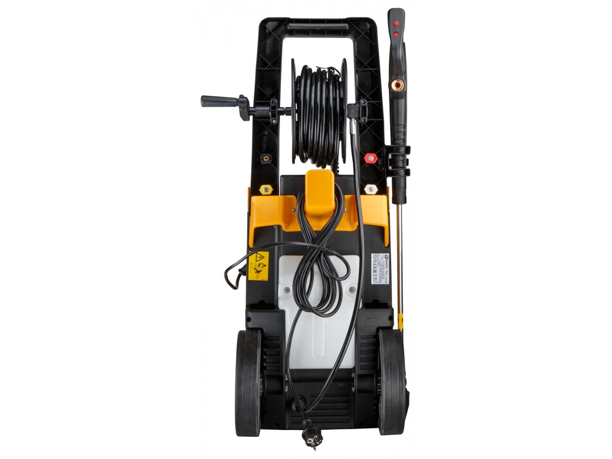 Комплектация: Очиститель высокого давления; Шланг высокого давления 8 м; Барабан для хранения шланга; Рукоятка; Емкость для моющего средства; Пистолет; Трубка-удлинитель; Набор веерных форсунок (4 шт); Головка форсунки TURBO; Щетка моющая; Щетка моющая роторная; Фильтр тонкой очистки; Набор крепежных деталей; Руководство по эксплуатации.