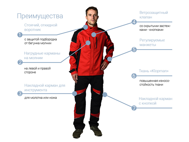 Куртка - укороченная с центральной застежкой на молнии с ветрозащитным клапаном на потайных кнопках. Защита подбародка от бегунка молнии. Два нагрудных кармана на молниях. На левом рукаве карман. Слева внутренний карман на "липучке". Манжеты с утяжкой на "липучке". СОП на рукавах, спине.