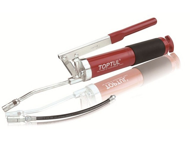 Шприц-масленка с гибким шлангом 12" Топтул имеет объем 400 мл. Подходит для большинства туб для смазки. У шприца-масленки с гибким шлангом регулируемый ход (двухступенчатое сжатие). Применим при ремонте моторной и ходовой части автомобиля и при обслуживании других деталей машин и агрегатов в точках трения. Общая длина шприца составляет 530 мм, укомплектован жесткой трубкой с 4-х кулачковым зажимным наконечником и гибким шлангом с наконечником для работы в труднодоступных местах.