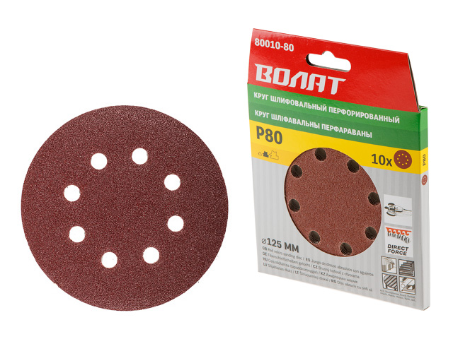 Шлифлист 125мм круг Р 60 д/дерева 8 отв. 10шт. ВОЛАТ (круг абразивный шлифовальный перфорированный)