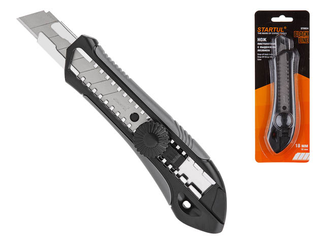 Нож пистолетный с выдвижным лезвием 18мм BLACK LINE STARTUL (ST0924) (ABS+TPR покрытие корпуса)