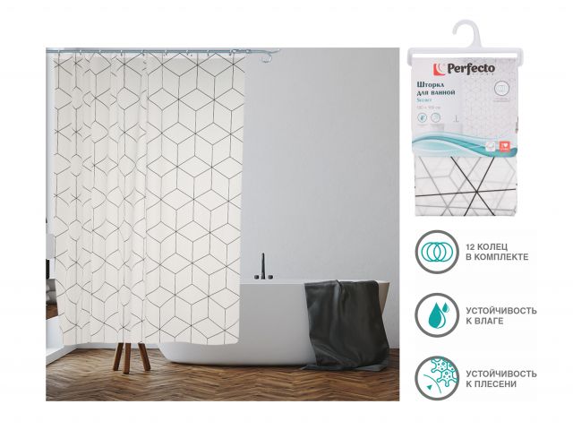 Как получить "Шторка для ванной (12 колец в комплекте), 180x180 см, Secret, геометрия, белая, PERFECTO LINEA (Материал: ПЭВА)":