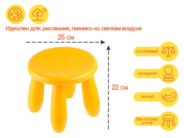 За удобным табуретом ребенок может рисовать, играть, делать поделки и даже устроить пикник в саду на свежем воздухе. Легкий, но устойчивый детский стульчик ребенок без труда перенесет из комнаты в комнату или в сад.Детский пластиковый табурет можно использовать на открытом воздухе, так как мебель устойчива к погодным условиям и загрязнениям. Табурет детский легко собрать - компоненты просто соединяются до щелчка.