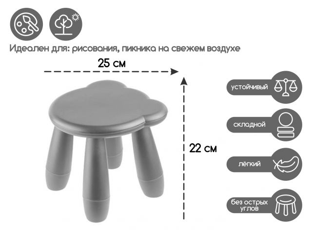За удобным табуретом ребенок может рисовать, играть, делать поделки и даже устроить пикник в саду на свежем воздухе. Легкий, но устойчивый детский стульчик ребенок без труда перенесет из комнаты в комнату или в сад.Детский пластиковый табурет можно использовать на открытом воздухе, так как мебель устойчива к погодным условиям и загрязнениям. Табурет детский легко собрать - компоненты просто соединяются до щелчка.