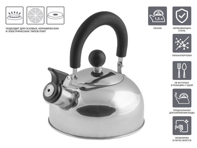 Чайник со свистком, нержавеющая сталь, 1.5 л, серия Holiday, серебристый металлик, PERFECTO LINEA (Общий объем изделия 1,5л, полезный объем 1,2л)