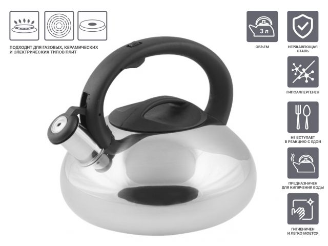 Как получить "Чайник со свистком, нержавеющая сталь, 3.0 л, серия Ufo, серебристый металлик, PERFECTO LINEA (диаметр 22 см, высота 19.5 см, общий объем изделия 3,0л":