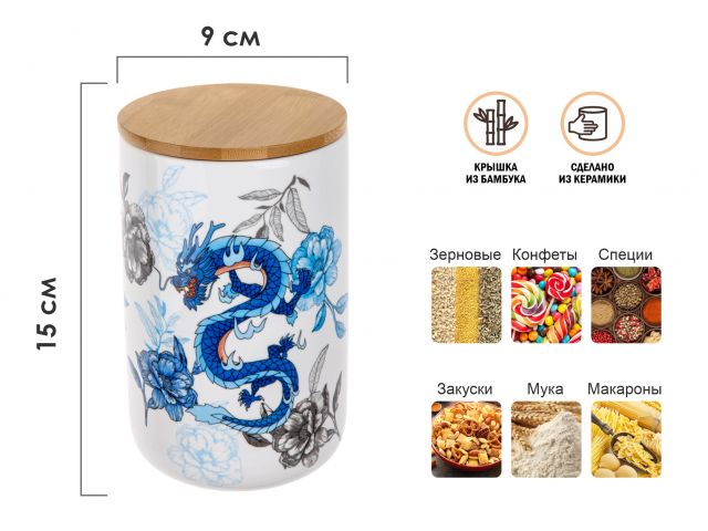 Банка украшена принтом дракона - символом года дракона, что делает ее отличным подарком для любителей азиатской культуры. Керамический материал обеспечивает сохранность вкуса и аромата продуктов, не вступая в химическую реакцию с ними, а также легко моется и сохраняет свою первоначальную внешность на протяжении длительного времени.