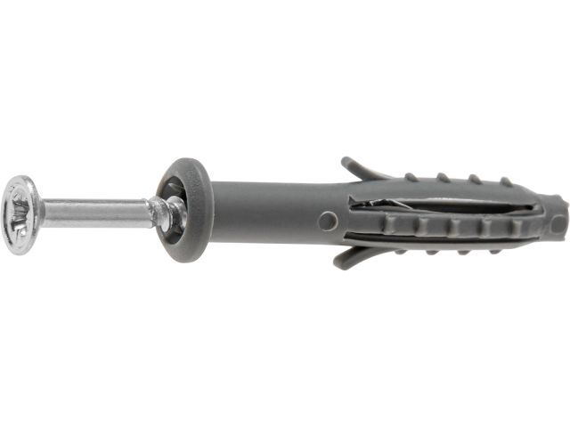 Особенности: для установки необходимо предварительно просверлить отверстие. Прочность крепежа достигается расклиниванием дюбеля в отверстии гвоздем в момент удара молотком. С помощью крестообразного шлица на головке гвоздя можно легко ослабить или усилить крепеж, демонтировать его. Более надежное крепление благодаря большой площади соприкосновения с прикрепляемой деталью. Дополнительные усы исключают проворачиваемость при установке.